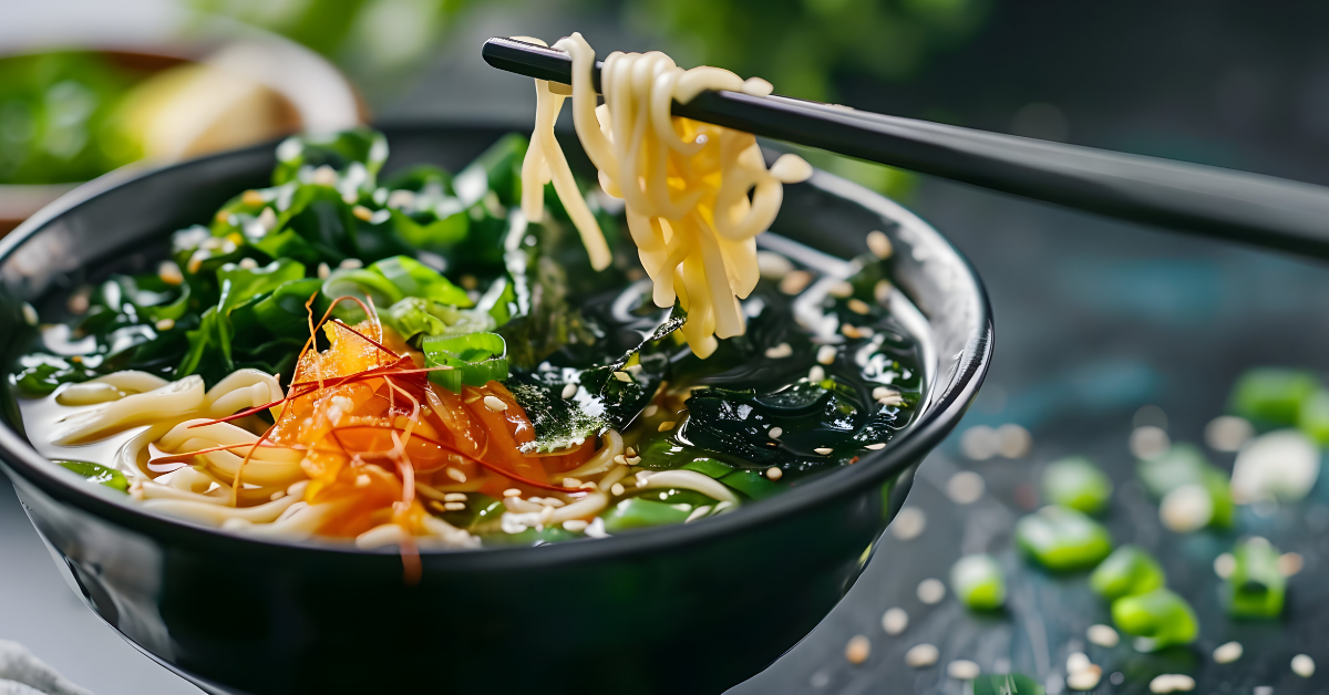 Canh Rong Biển 1,2,3 Ngon còn có thể dùng làm nền nước dùng cho các món mì nước như mì udon, bún chay hoặc mì rau củ. Chỉ cần pha canh theo hướng dẫn, sau đó cho thêm mì và topping đơn giản là đã có ngay món nước thanh nhẹ nhưng vẫn đầy đủ dinh dưỡng.