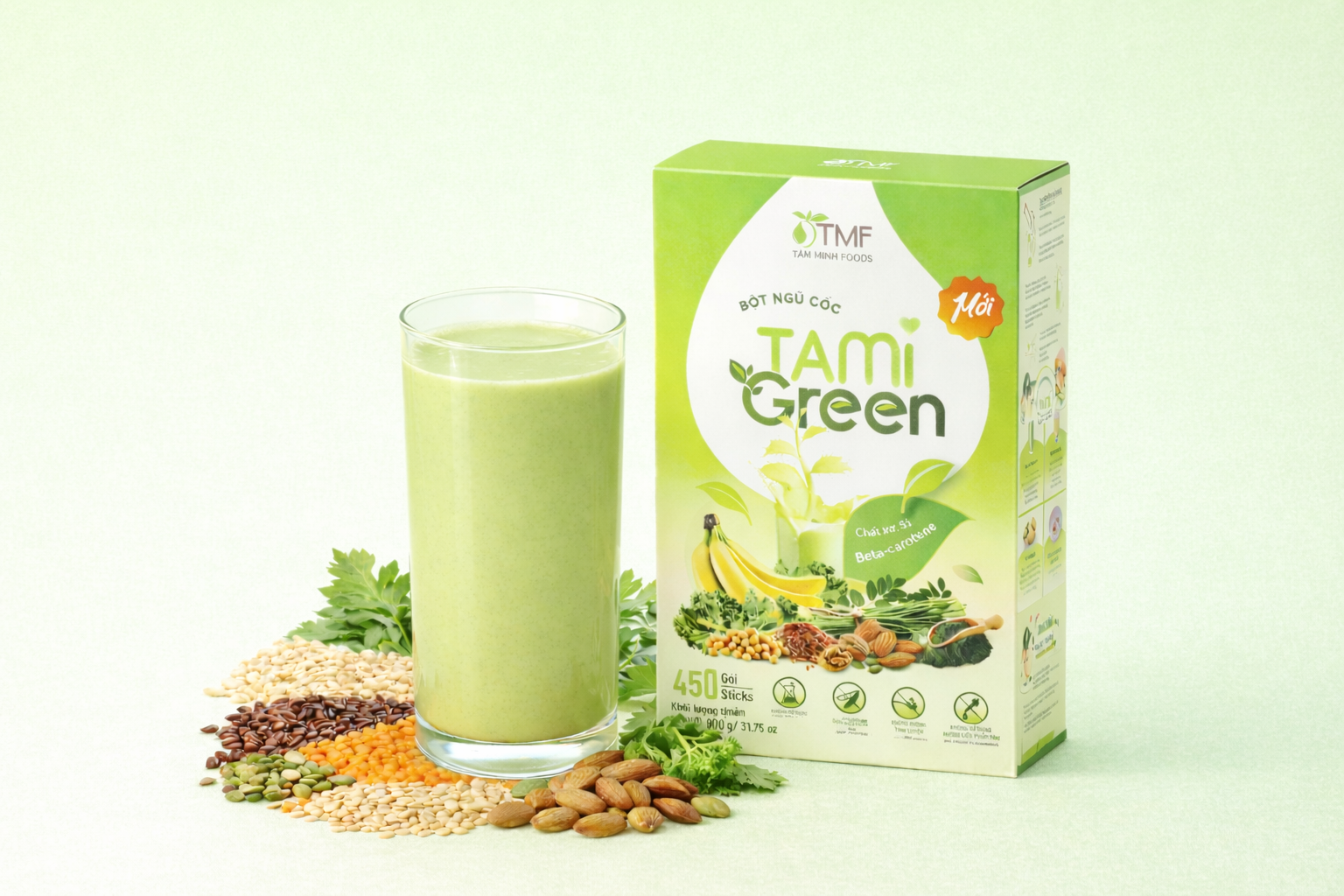 Bột Ngũ Cốc TamiGreen của Tâm Minh Foods được phối trộn từ 9 loại đậu, hạt và ngũ cốc nguyên cám, đặc biệt nổi bật với các thành phần nảy mầm như gạo lứt, đậu đỏ và đậu gà. Bên cạnh đó, sản phẩm còn được tăng cường các loại rau xanh như cải kale, chùm ngây, cỏ lúa mì, cần tây và tảo spirulina – những “siêu thực phẩm xanh” giàu vitamin và khoáng chất, góp phần hỗ trợ sức khỏe tổng thể và tăng cường sức đề kháng cho cơ thể.